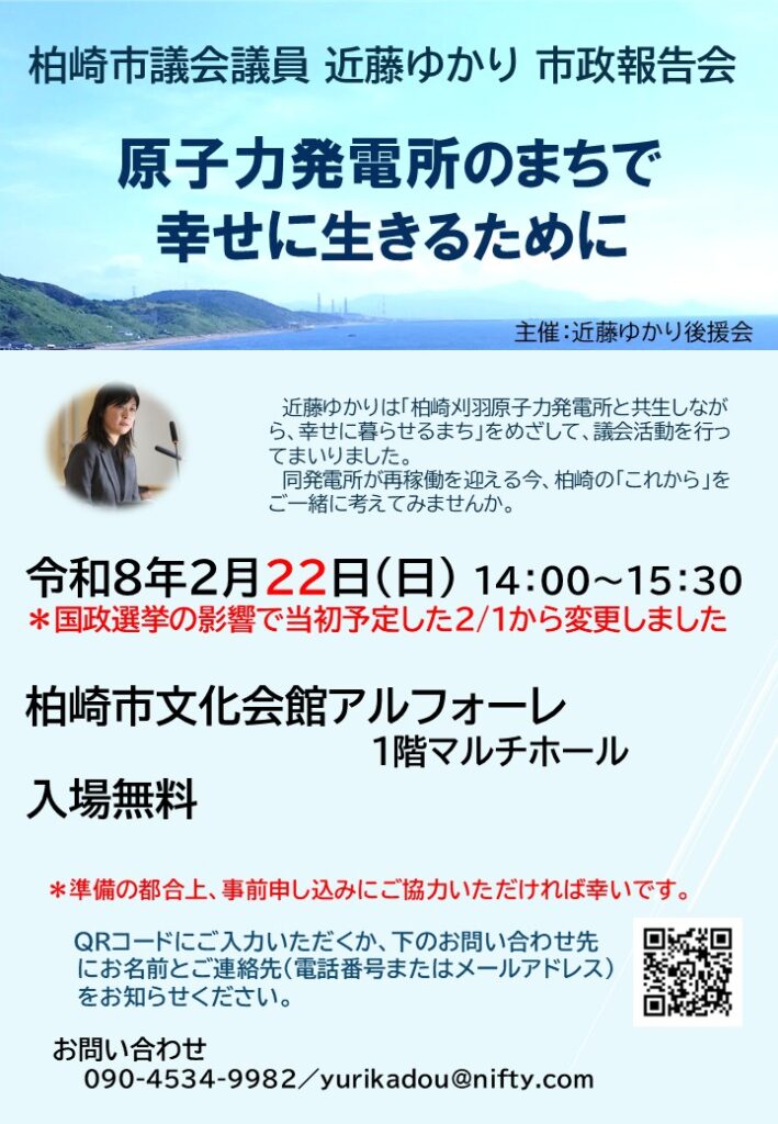 令和8年2月22日(日)14時~ 柏崎文化会館アルフォーレ・マルチホール(1階)において、「原子力発電所のまちで幸せに生きるために」というテーマの市政報告会を開催いたします。