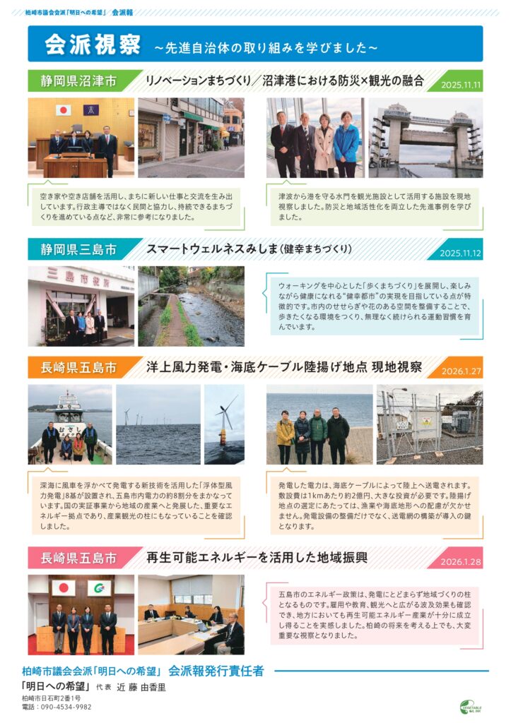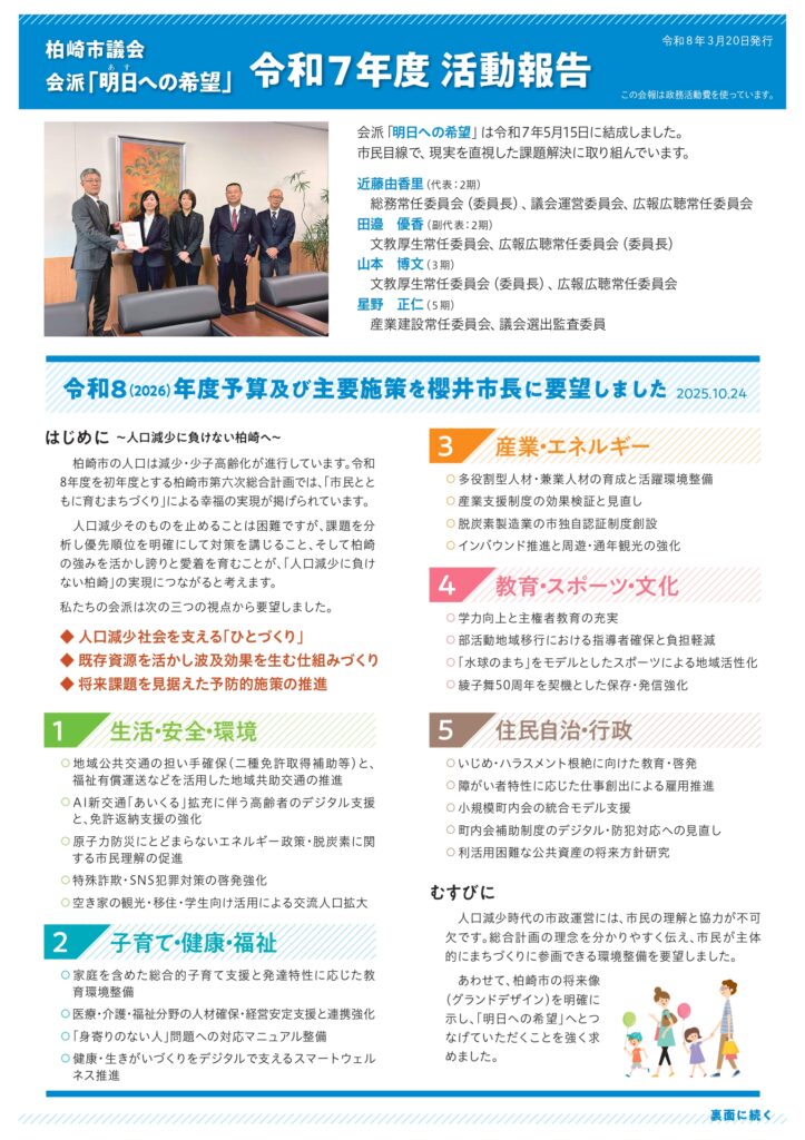 所属会派「明日への希望」の令和7年度 活動報告を発行しました。